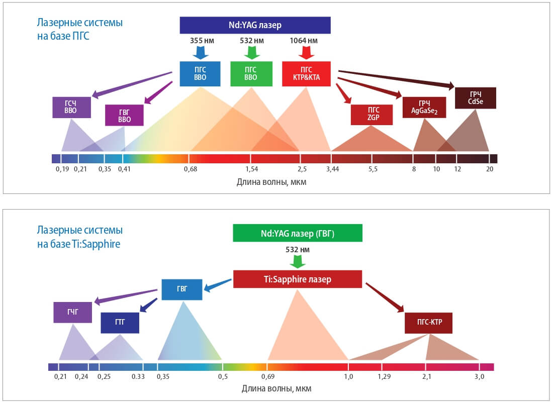 Combining various laser and nonlinear converters using the most advanced active media and nonlinear crystals allows us to provide laser output both with any set of fixed wavelengths and with a possibility of continuous wavelength tuning within the range from 0.2 μm to 20 μm.