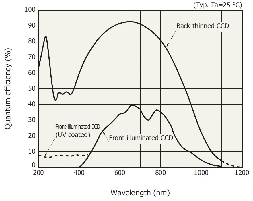 The SC125 may contain as a detector either one of two non-cooled Hamamatsu back-thinned CCD-arrays without a charge-storage section (back-thinned FFT CCD), operating in the binning mode. Both arrays have wide spectral range and excellent sensitivity in the UV (see below for the curves of each detector spectral sensitivity and their specifications). These two arrays differ in quantum efficiency, data reading rate, dynamic range, and in pixel active area size.
