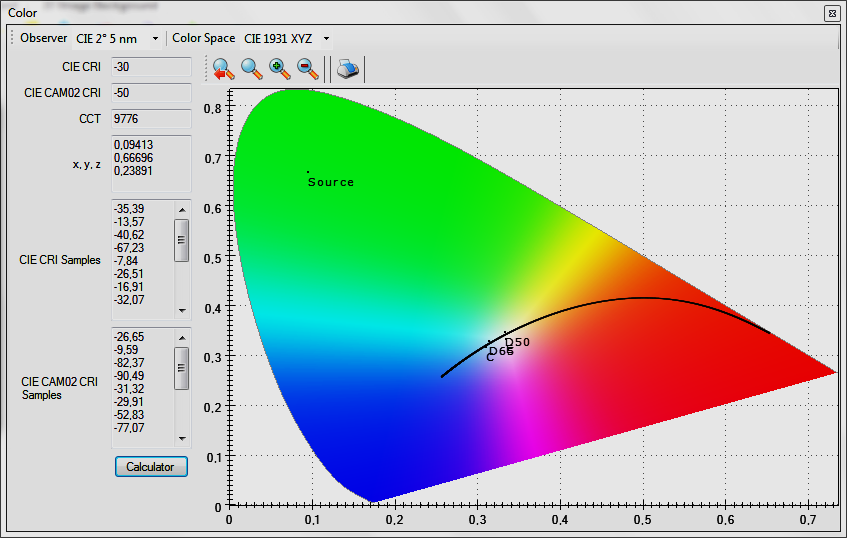 The panel plots the active color space, the black body curve, several reference standard illuminative sources (C, D50, D65) and the Source point, that relates to the measured light source.