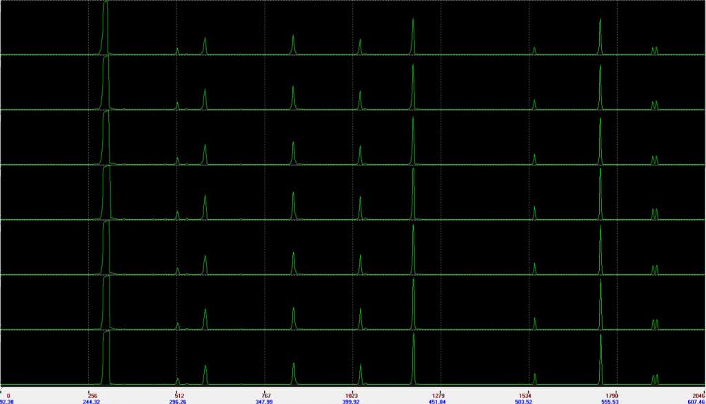 S200-MF: одновременная регистрация спектра Hg лампы с помощью 8-ми световодов, λ= 250-600нм.
