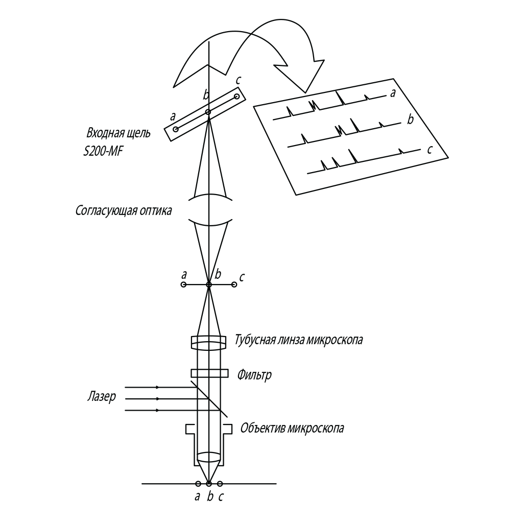 Оптический спектрометр S200-MF имеет входную щель фиксированной ширины и может работать как с оптическими волокнами, так и без них. При прямом вводе излучения в спектрометр изображение анализируемого участка объекта проецируется непосредственно на входную щель, а на детекторе спектрометра регистрируется спектральная информация от выбранного участка с высоким пространственным разрешением.