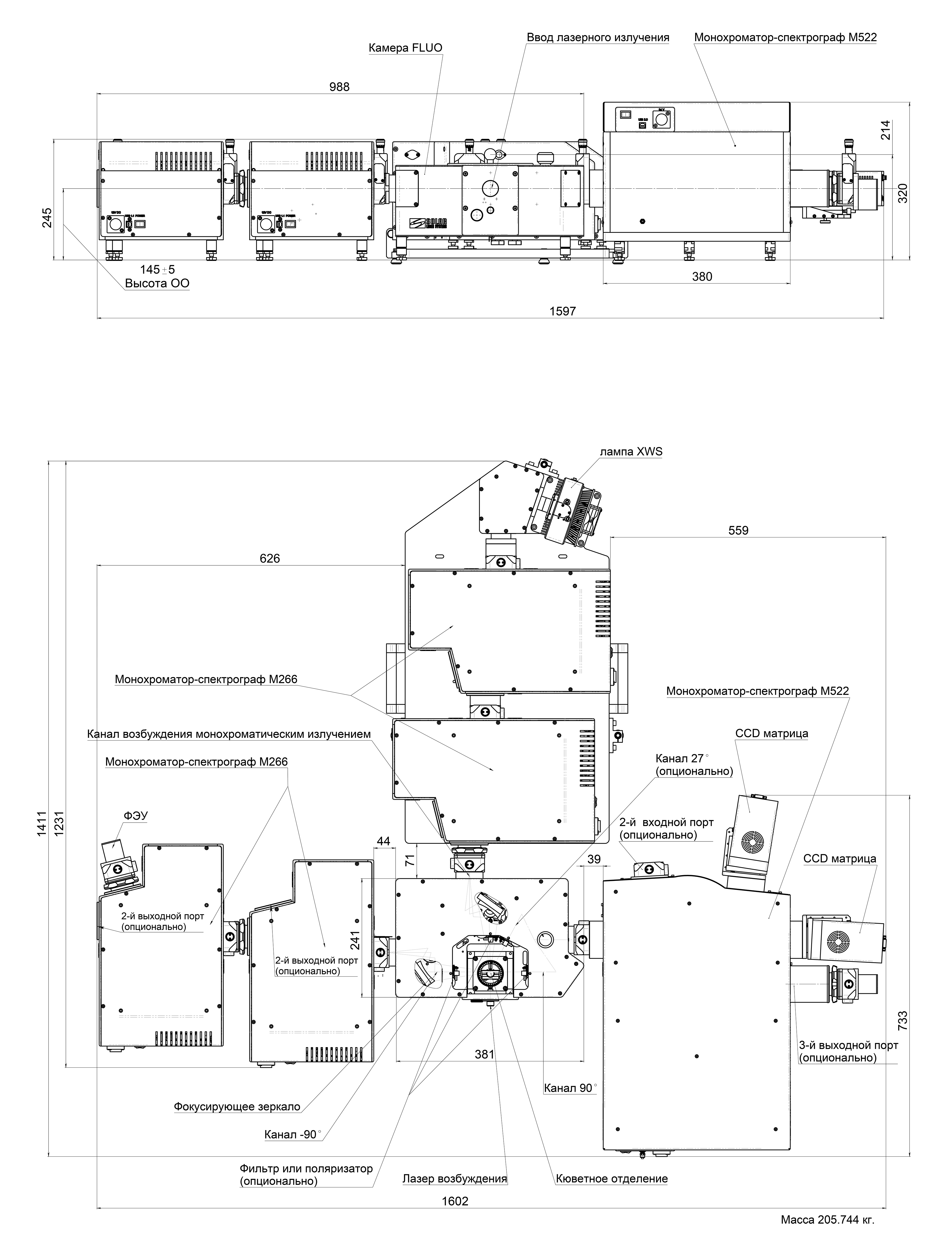 В качестве примера приводим габаритные размеры флуорометрического комплекса FLUO на базе двойного монохроматора M266 на возбуждения, двойного спектрографа M266 на первый канал регистрации и спектрографа M522 на второй канал регистрации.