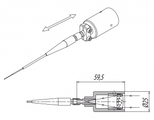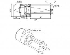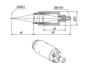 Устройство сбора излучения с образца, расположенного на расстоянии 40мм. Предназначен для сбора излучения от образца в широком спектральном диапазоне УФ-ИК и эффективной передачи его в оптическое волокно либо на входную щель спектрального прибора. Состоит из двух УФ-объективов-ахроматов.