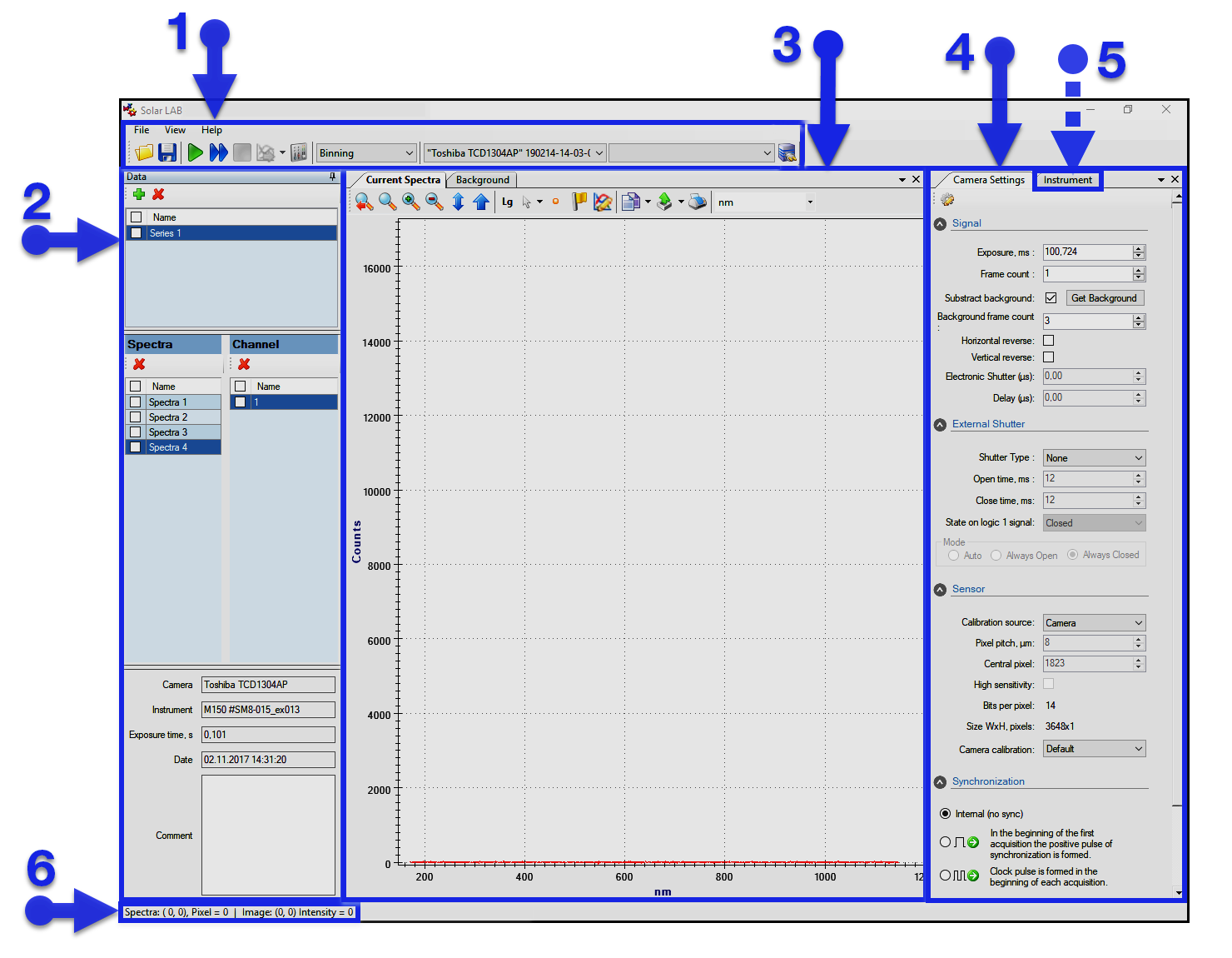 Контроль установок детектора, таких как время экспозиции, тип синхронизации с источником, регистрация темнового сигнала и др., осуществляется на одной из рабочих панелей программного обеспечения SolarLS.LAB.