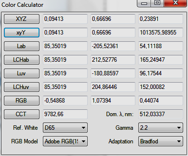 Часто бывает удобно пользоваться встроенным калькулятором цветовых координат. В графе xyY появятся значения цветовых координат, рассчитанных в панели Color (x,y,z). По нажатию на кнопку xyY будут рассчитаны нормированные цветовые координаты для иных цветовых пространств.